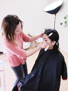 その後、モデルさんにお越しいただき、さっそくNさんがメイクを施します。