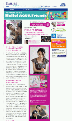 ●2007.7.02 コンタクトレンズ CIBA Vision(チバビジョン) デイリーズアクアWEBサイト HELLO AQUA Friends アクア交遊録 vol.5 コンタクトレンズメーカー:「チバビジョン」さんのウェブサイトコーナー 【「輝く瞳の女性にインタビュー ‘Hello! AQUA Friends/アクア交友録’」】に、 取材記事がアップされました。 「ひよっこメイク」誕生秘話から、現在の仕事に至るまでのエピソード、また、長年、ハードコンタクトユーザーであるわたしの‘目元状況’や、コンタクトユーザーさんへのメイクアドバイス、この時期おすすめな「夏の涼やかアイメイク」など、盛りだくさんにお伝えしています。 取材時には、初めて乱視用ソフトコンタクトも試させていただき、その自然な装用感に驚いたことも、とても印象に残りました。コンタクトユーザーさんはもちろん、メイクにご興味のある方みなさまにぜひご覧いただきたい内容です。 |